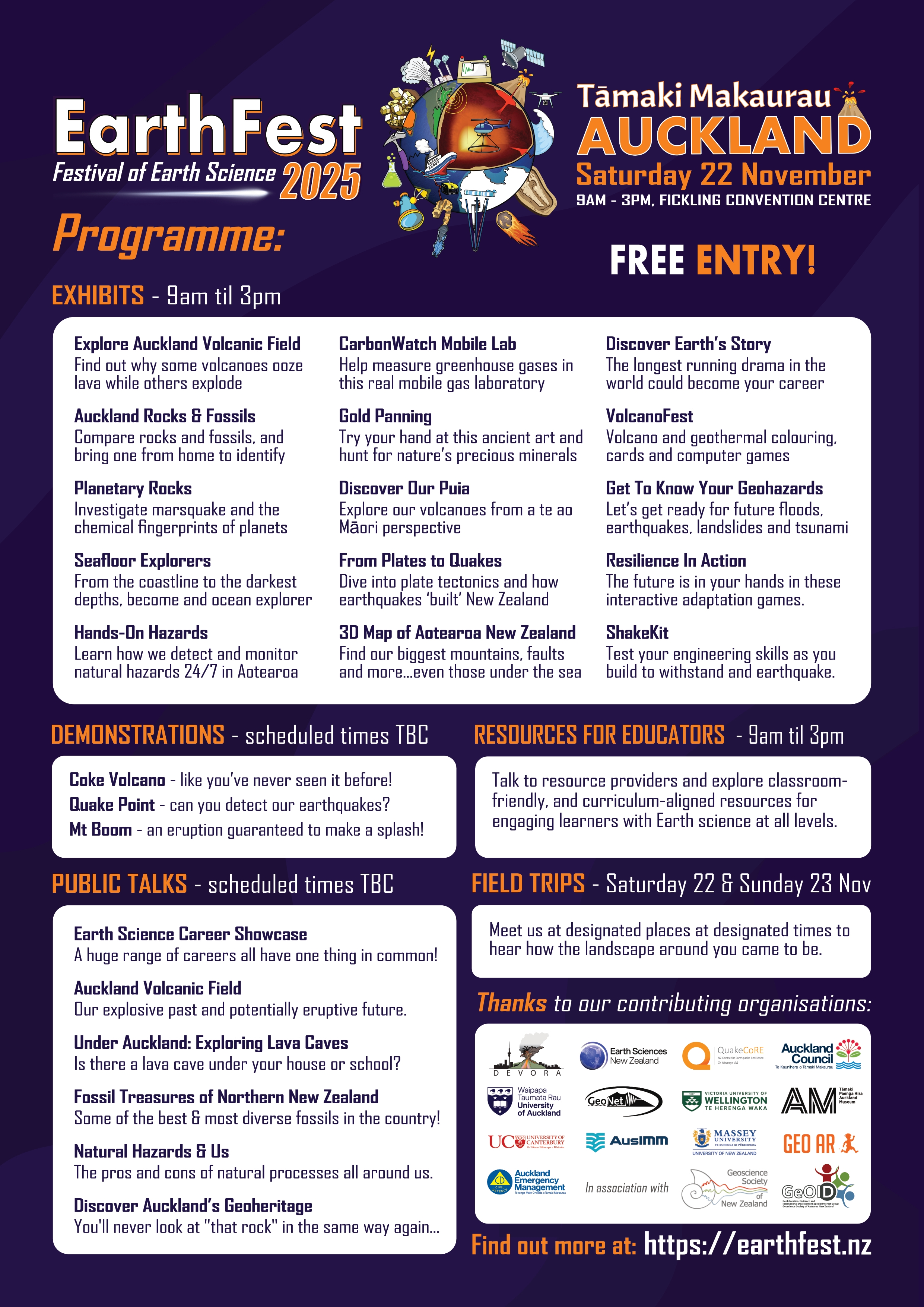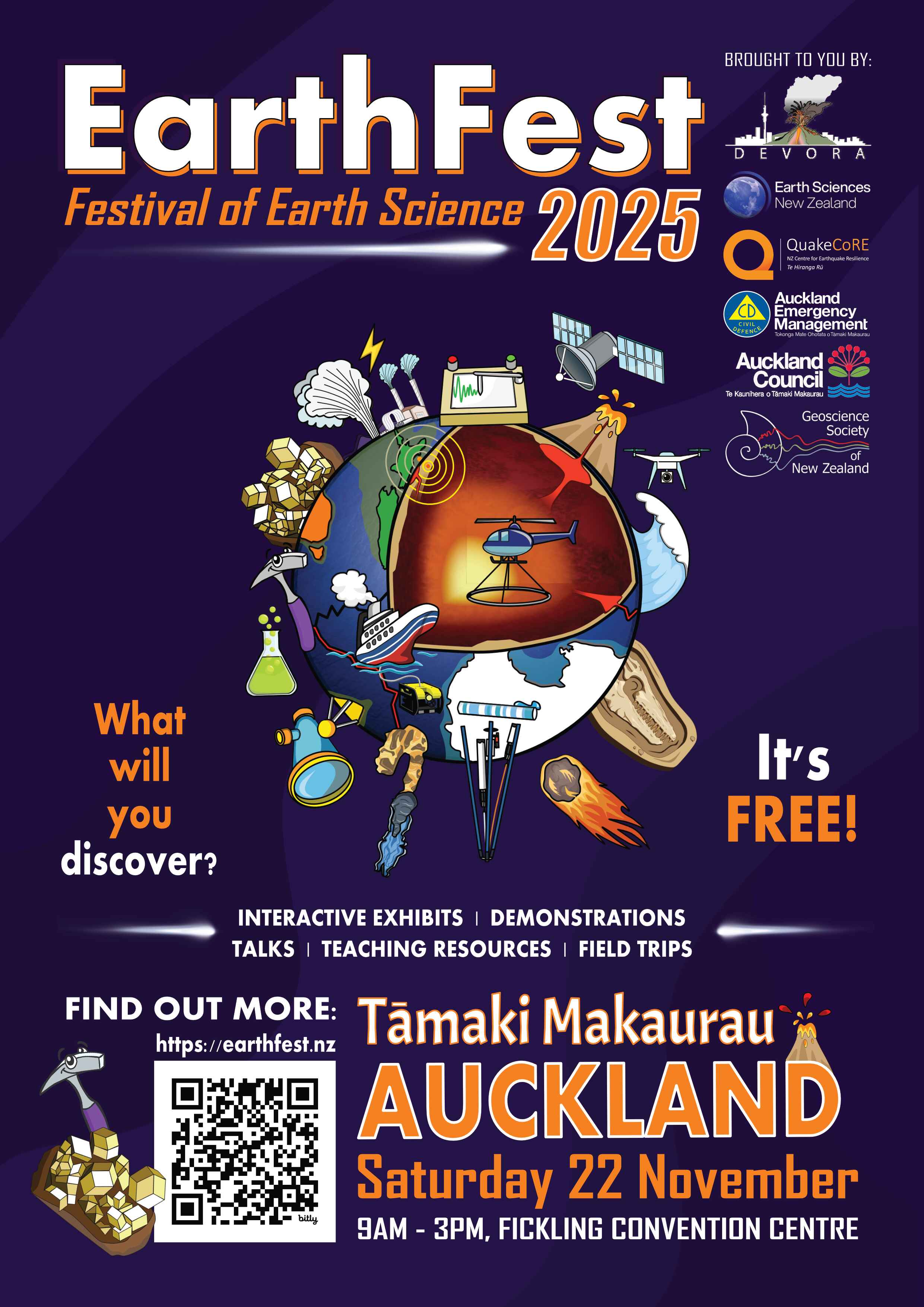 EarthFest is Aotearoa New Zealand's largest annual STEM festival dedicated to the Earth sciences. It's a great opportunity to share and promote your geoscientific endeavours to the people of Tāmaki Makaurau Auckland!