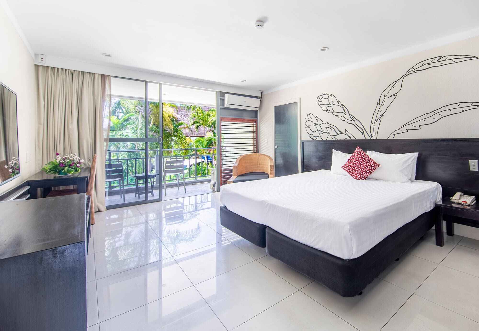 Double Deluxe rooms are located on the ground floor and have private patios.